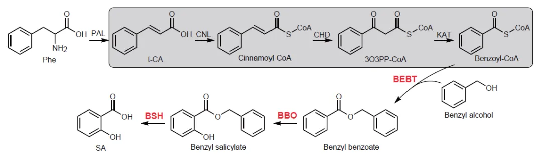 張躍林團(tuán)隊(duì)采用多學(xué)科攻堅(jiān)策略,結(jié)合化學(xué)遺傳篩選、轉(zhuǎn)錄組學(xué)、CRISPR基因編輯及精準(zhǔn)代謝分析,在本氏煙草中成功捕捉到PAL途徑的全貌。研究揭示了一條意想不到的三步酶促反應(yīng)(圖1):(1)酯化啟動(dòng):苯甲酰輔酶A:苯甲醇苯甲酰轉(zhuǎn)移酶(BEBT)催化苯甲酰輔酶A與苯甲醇結(jié)合,生成苯甲酸芐酯。(2)羥基化轉(zhuǎn)化:苯甲酸芐酯氧化酶(BBO)對苯甲酸芐酯進(jìn)行羥基化,生成水楊酸芐酯。(3)水解釋放:水楊酸芐酯水解酶(BSH)裂解水楊酸芐酯,最終釋放出水楊酸(SA)。