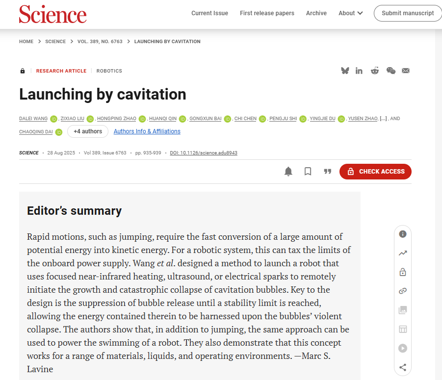 8月29日,浙江農(nóng)林大學(xué)全國重點(diǎn)實(shí)驗(yàn)室戴朝卿教授團(tuán)隊(duì)與加州大學(xué)洛杉磯分校賀曦敏教授團(tuán)隊(duì)合作,在國際頂級學(xué)術(shù)期刊Science上發(fā)表了題為Launching by Cavitation的研究論文。這也是浙江農(nóng)林大學(xué)學(xué)者首次以第一完成單位和通訊作者單位在Science雜志上發(fā)表研究論文。