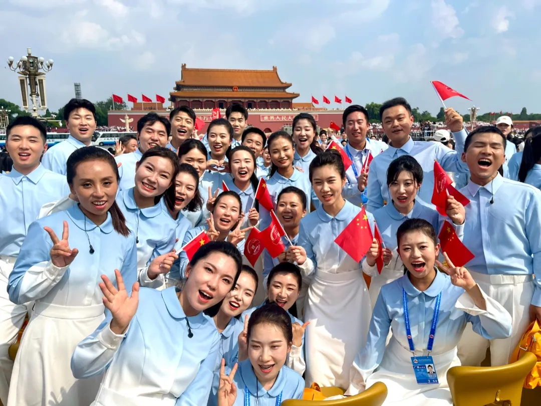 廣場(chǎng)合唱團(tuán)成員、國(guó)科大管理科學(xué)與工程專業(yè)碩士生吳虹奕:雖然已經(jīng)歷經(jīng)多次廣場(chǎng)演練,但是當(dāng)合唱團(tuán)倒數(shù)一秒秒逼近,我的緊張和期盼不減分毫;望著日出東方準(zhǔn)備唱出“我們?cè)谔猩缴稀保髁恋男叛鲆廊蛔茻p眼;飛行梯隊(duì)從身后天空中劃過(guò)遮擋陽(yáng)光的一瞬間,我仍然感到了強(qiáng)盛軍力帶來(lái)的絕對(duì)安全感,以及無(wú)限的幸福和自豪。無(wú)比幸運(yùn),我們生逢盛世;繼往開來(lái),我們重任在肩!
