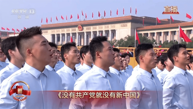 伴隨著軍樂團(tuán)的演奏,《松花江上》《在太行山上》《保衛(wèi)黃河》《沒有共產(chǎn)黨就沒有新中國(guó)》等經(jīng)典曲目被唱響,大家用豪邁的歌聲,追憶烽火歲月,唱出中華兒女的不屈和希望,致敬偉大的抗戰(zhàn)精神。