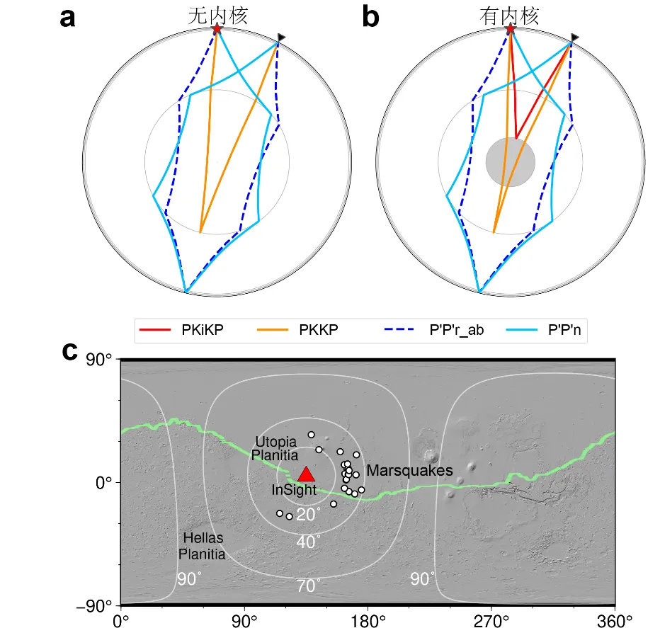 為突破這一挑戰(zhàn),研究團(tuán)隊(duì)創(chuàng)新性地引入火震陣列分析方法,通過對(duì)23個(gè)信噪比較高的火震事件數(shù)據(jù)的分析,成功提取出穿過火星核的關(guān)鍵震相,如在地表反射的PKPPKP(P'P')和在核幔邊界反射的PKKP(下圖a)。特別值得注意的是,實(shí)際觀測(cè)到的PKKP到時(shí),較當(dāng)前僅考慮液態(tài)核的火星速度模型所預(yù)測(cè)的結(jié)果提前了50至200秒。地震波在固體中的傳播速度比在液體中快。因此,這一差異表明,火星核具有分層結(jié)構(gòu):即外層為液態(tài)核,而更深部則存在一個(gè)波速更高的固態(tài)內(nèi)核。