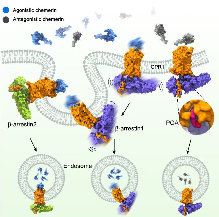 趨化素(chemerin)是一種重要的脂肪因子,參與調(diào)控脂質(zhì)代謝和胰島素敏感性,與肥胖、糖尿病等代謝性疾病的發(fā)生發(fā)展密切相關(guān)。同時(shí),趨化素還能介導(dǎo)免疫細(xì)胞定向遷移至炎癥部位,參與機(jī)體抵御病原入侵、維持穩(wěn)態(tài)和修復(fù)組織損傷等重要生理過(guò)程,在炎癥與代謝之間發(fā)揮“橋梁”作用。趨化素的生物學(xué)效應(yīng)由其受體介導(dǎo),包括CMKLR1和GPR1。其中,CMKLR1作為一種典型的G蛋白偶聯(lián)受體(GPCR),通過(guò)G蛋白信號(hào)通路驅(qū)動(dòng)脂質(zhì)代謝與炎癥反應(yīng),而GPR1則是一種非典型的GPCR,依賴于阻遏蛋白介導(dǎo)的信號(hào)通路和受體內(nèi)吞,清除過(guò)量的趨化素。趨化素及其受體通過(guò)這種“經(jīng)典激活—非典型平衡”的雙重機(jī)制,在代謝平衡和炎癥反應(yīng)調(diào)控中發(fā)揮關(guān)鍵作用,但相關(guān)分子機(jī)制一直未被明確闡明。