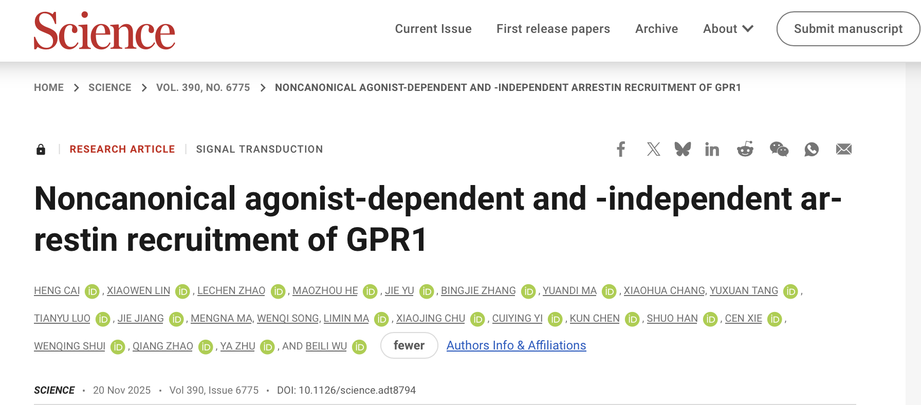 北京時(shí)間11月21日凌晨,國(guó)科大杭州高等研究院(以下簡(jiǎn)稱“杭高院”)藥物科學(xué)與技術(shù)學(xué)院(以下簡(jiǎn)稱“藥學(xué)院”)/中國(guó)科學(xué)院上海藥物研究所(以下簡(jiǎn)稱“上海藥物所”)吳蓓麗課題組聯(lián)合臨港實(shí)驗(yàn)室朱亞課題組、上海藥物所趙強(qiáng)課題組、上海科技大學(xué)水雯菁課題組和上海藥物所謝岑課題組最新成果——“Noncanonical agonist-dependent and -independent arrestin recruitment of GPR1”在國(guó)際頂級(jí)學(xué)術(shù)期刊Science正式發(fā)表。