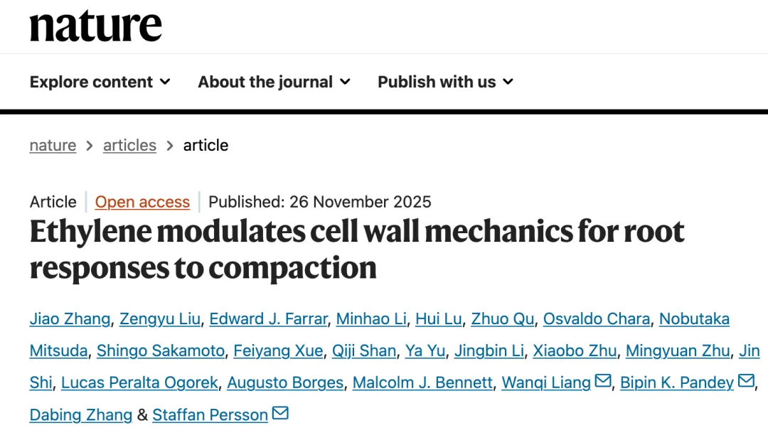 近日,上海交通大學(xué)生命科學(xué)技術(shù)學(xué)院張大兵和梁婉琪教授團(tuán)隊(duì)聯(lián)合丹麥哥本哈根大學(xué)Staffan Persson教授團(tuán)隊(duì)、英國諾丁漢大學(xué)Malcolm J. Bennett教授團(tuán)隊(duì)在國際學(xué)術(shù)期刊《自然》(Nature)上發(fā)表題為“Ethylene modulates cell wall mechanics for root responses to compaction”的最新研究,首次揭示了植物根系利用工程學(xué)原理適應(yīng)板結(jié)土壤:通過主動(dòng)響應(yīng)積累的乙烯,精細(xì)調(diào)控細(xì)胞壁厚度,從而促進(jìn)根系增粗,提高穿透能力以適應(yīng)土壤板結(jié)。