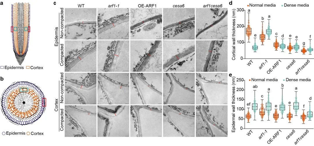 實(shí)驗(yàn)驗(yàn)證了這一機(jī)制的精確性:缺失OsARF1的突變體(arf1-1)皮層細(xì)胞壁始終"厚重",無法膨脹;而過量表達(dá)OsARF1(OE-ARF1)和纖維素合成酶突變體(cesa6)則形成"薄軟"皮層,可自由膨脹穿透板結(jié)層。
