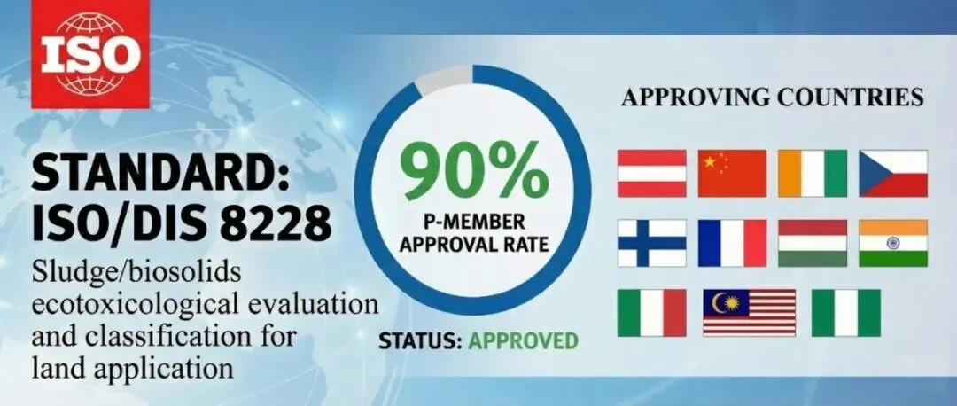 近日,國際標(biāo)準(zhǔn)化組織(ISO)正式公布ISO/DIS 8228《污泥土地利用風(fēng)險評估及分級標(biāo)準(zhǔn)》(Sludge/biosolids ecotoxicological evaluation and classification for land application)制定的最終投票結(jié)果。根據(jù)ISO技術(shù)委員會的統(tǒng)計數(shù)據(jù),該標(biāo)準(zhǔn)送審案在參與投票的成員國中獲得90%的高票通過,遠(yuǎn)超國際標(biāo)準(zhǔn)化組織規(guī)定的66.66%通過線,充分展示國際上對中國提出的污泥安全資源化系統(tǒng)解決方案與標(biāo)準(zhǔn)的高度肯定。