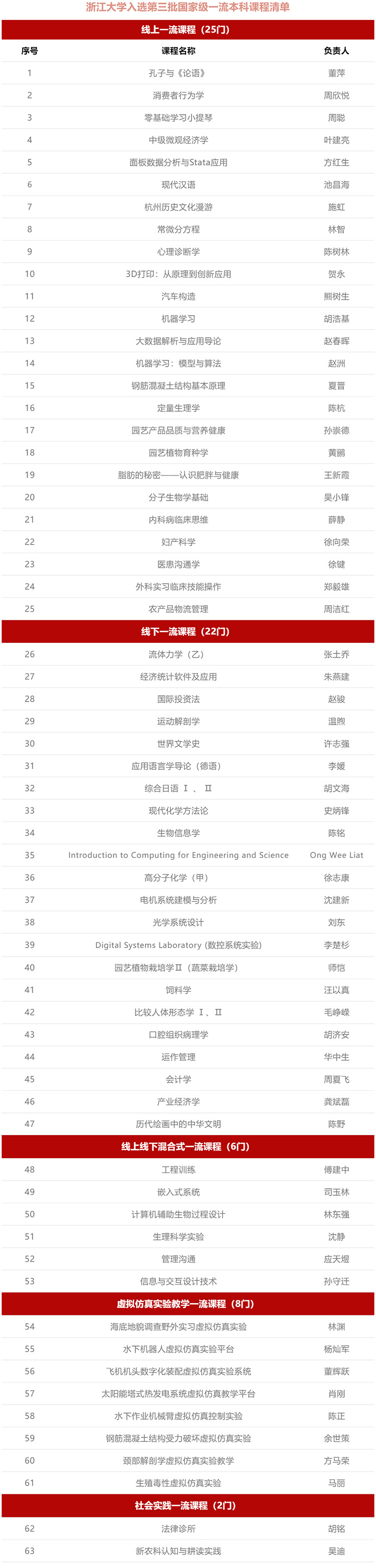 浙江大學(xué)本次共有63門課程入選,入選數(shù)量高居全國高校榜首,其中包括線上一流課程25門,線下一流課程22門,線上線下混合式一流課程6門,虛擬仿真實驗教學(xué)一流課程8門,社會實踐一流課程2門。截止目前,浙江大學(xué)國家級一流本科課程三批共計184門課程入選,總量位列全國第三。
