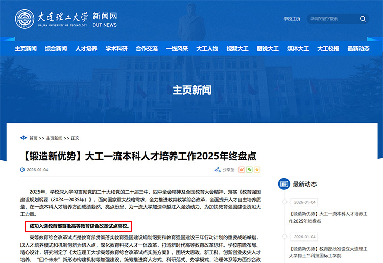 1月4日,大連理工大學發(fā)布一流本科人才培養(yǎng)工作2025年終盤點,其中提到:高等教育綜合改革試點是教育部貫徹落實教育強國建設規(guī)劃綱要和教育強國建設三年行動計劃的重要戰(zhàn)略舉措,以人才培養(yǎng)模式和機制創(chuàng)新為切入點,深化教育科技人才一體改革,打造新時代高等教育改革標桿。學校前瞻布局、精心設計,研究制定了《大連理工大學高等教育綜合改革試點實施方案》,圍繞大思政、新工科、創(chuàng)新創(chuàng)業(yè)拔尖人才培養(yǎng)、“四個未來”新形態(tài)構建機制等加強建設,統(tǒng)籌推進育人方式、科研范式、辦學模式、治理體系等方面綜合改革。學校憑借扎實的改革基礎、突出的改革實效和完備的改革方案,于2025年12月成為少數以“揭榜掛帥”方式成功入選教育部首批高等教育綜合改革試點的高校(全國共入選39所)。