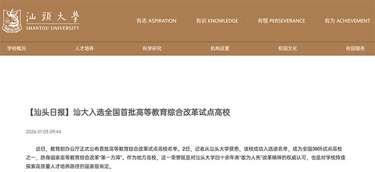 近日,教育部辦公廳正式公布首批高等教育綜合改革試點高校名單,汕頭大學憑借鮮明的辦學特色與扎實的改革基礎,入選全國39所試點高校之一,躋身國家高等教育綜合改革“第一方陣”。