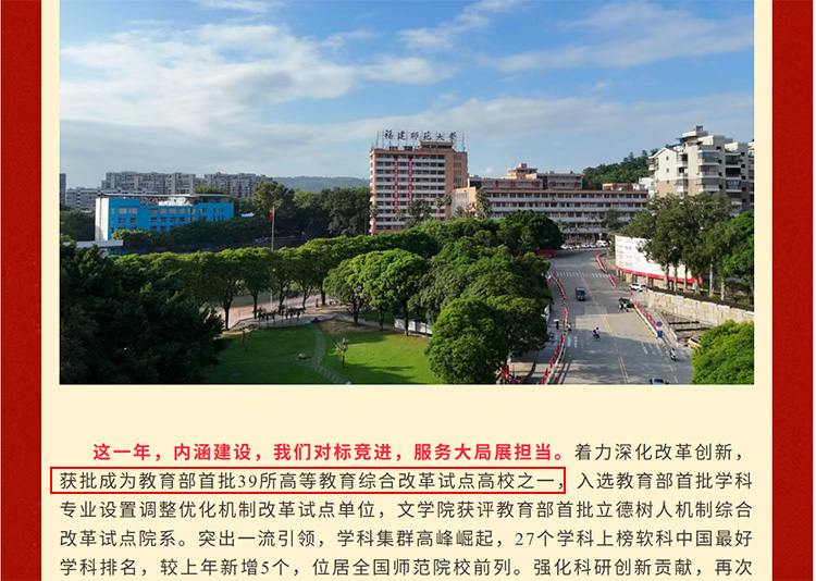 福建師范大學發(fā)布2026年新年賀詞,其中提到:著力深化改革創(chuàng)新,獲批成為教育部首批39所高等教育綜合改革試點高校之一,入選教育部首批學科專業(yè)設置調整優(yōu)化機制改革試點單位,文學院獲評教育部首批立德樹人機制綜合改革試點院系。