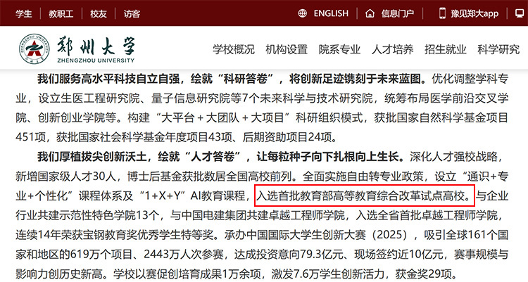 鄭州大學發(fā)布2026年新年賀詞,其中提到:全面實施自由轉專業(yè)政策,設立“通識+專業(yè)+個性化”課程體系及“1+X+Y”AI教育課程,入選首批教育部高等教育綜合改革試點高校。與企業(yè)行業(yè)共建示范性特色學院13個,與中國電建集團共建卓越工程師學院,入選全省首批卓越工程師學院,連續(xù)14年榮獲寶鋼教育獎優(yōu)秀學生特等獎。承辦中國國際大學生創(chuàng)新大賽(2025),吸引全球161個國家和地區(qū)的619萬個項目、2443萬人次參賽,達成投資意向79.3億元、現(xiàn)場簽約近10億元,賽事規(guī)模與影響力創(chuàng)歷史新高。學校以賽促創(chuàng)培育成果1萬余項,激發(fā)7.6萬學生創(chuàng)新活力,獲金獎29項。