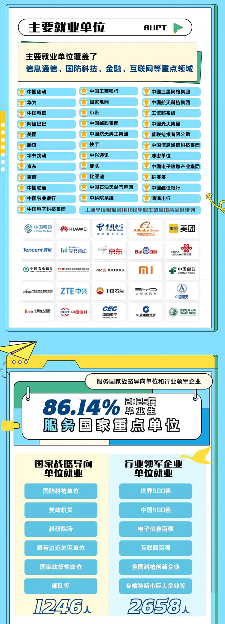 截至2025年10月31日,北京郵電大學(xué)總體畢業(yè)去向落實(shí)率為94.35%。其中本科畢業(yè)生去向落實(shí)率為90.35%,另有5.63%本科畢業(yè)生擬繼續(xù)深造。碩士畢業(yè)生去向落實(shí)率為98.51%,博士畢業(yè)生去向落實(shí)率為96.41%。