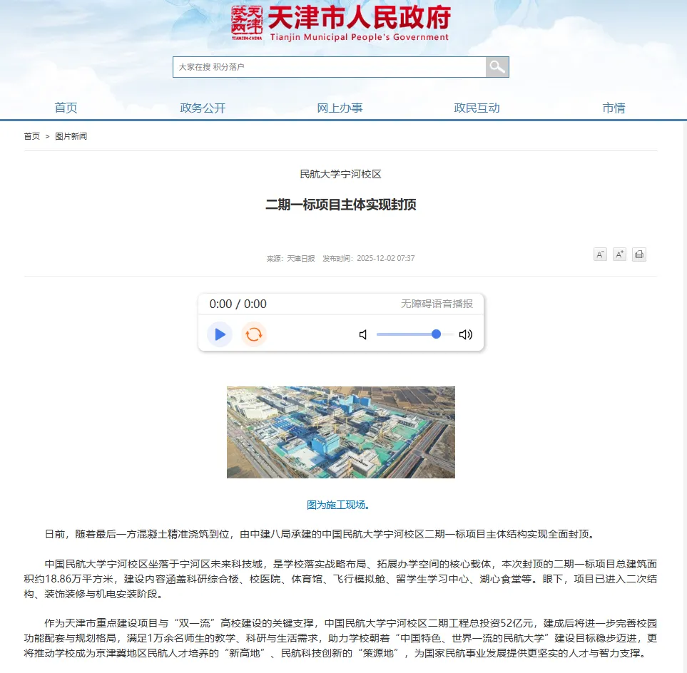 近期,據(jù)天津人民政府官網(wǎng)消息,中國(guó)民航大學(xué)寧河校區(qū)二期一標(biāo)項(xiàng)目主體結(jié)構(gòu)實(shí)現(xiàn)全面封頂。該工程總投資52億元,總建筑面積約18.86萬(wàn)平方米。