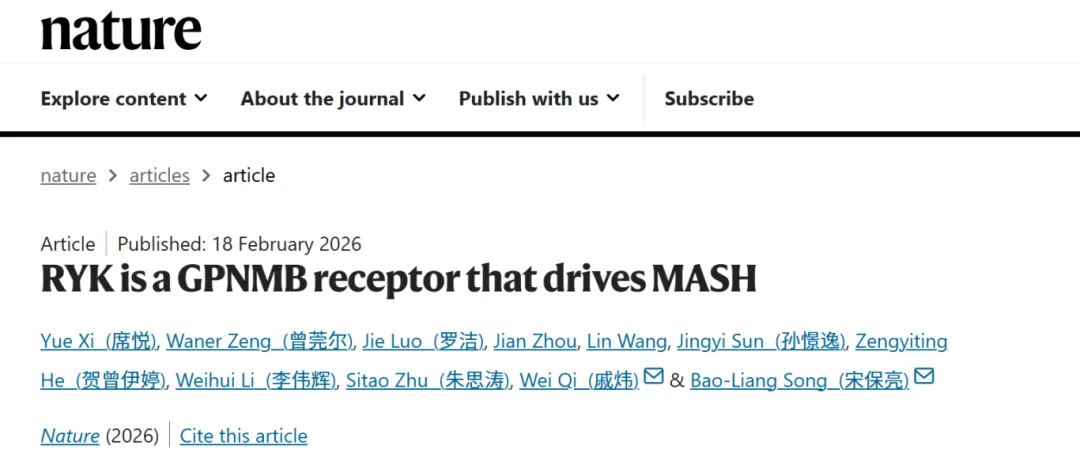 2月18日,武漢大學(xué)宋保亮院士團(tuán)隊(duì)在《自然》(Nature)雜志發(fā)表題為“RYK is a GPNMB receptor that drives MASH”的研究論文。該研究發(fā)現(xiàn)GPNMB-RYK新型配體-受體途徑介導(dǎo)MASH的發(fā)生發(fā)展,揭示肝細(xì)胞脂代謝重編程關(guān)鍵調(diào)控分子GPNMB,通過蛋白酶切割,生成功能形式的分泌型GPNMB胞外域(G-ECD),并首次鑒定單次跨膜蛋白RYK為G-ECD的功能性受體,通過增強(qiáng)肝脂攝取和合成,最終驅(qū)動MASLD/MASH。靶向GPNMB-RYK信號軸的多種治療策略,包括G-ECD疫苗、中和抗體、AAV-shRNA、GalNAC-siRNA均能有效地預(yù)防或治療MASLD/MASH。武漢大學(xué)生命科學(xué)學(xué)院、泰康生命醫(yī)學(xué)中心博士后席悅為第一作者,武漢大學(xué)復(fù)雜生命體代謝與調(diào)控全國重點(diǎn)實(shí)驗(yàn)室、泰康生命醫(yī)學(xué)中心主任宋保亮院士和上??萍即髮W(xué)教授戚煒為共同通訊作者。