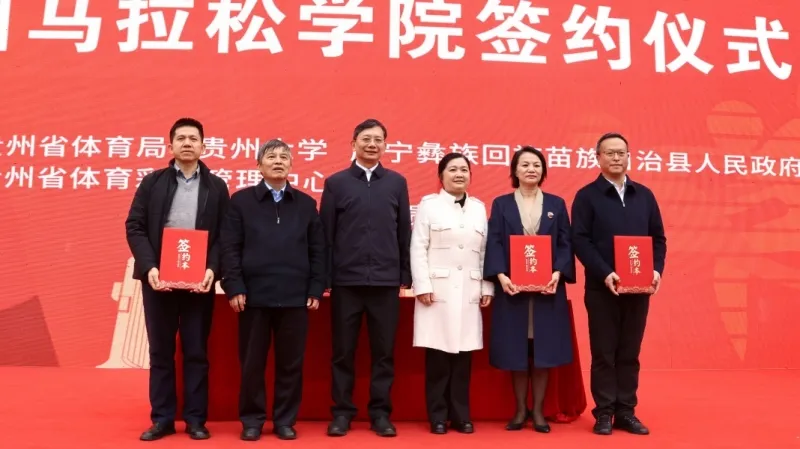 儀式上,三方代表共同簽署了貴州馬拉松學(xué)院框架協(xié)議,相關(guān)領(lǐng)導(dǎo)、專家和體育界代表一同為學(xué)院揭牌。
