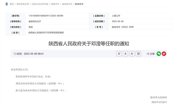 5月6日,陜西省人民政府網(wǎng)站發(fā)布《陜西省人民政府關(guān)于鄧瀅等任職的通知,任命鄧瀅、黃立波為西安外國(guó)語(yǔ)大學(xué)副校長(zhǎng)(均試用期一年)。