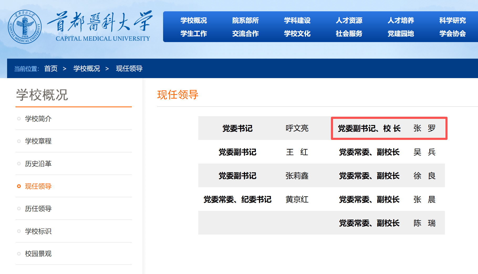 近日,首都醫(yī)科大學(xué)官網(wǎng)“現(xiàn)任領(lǐng)導(dǎo)”欄目顯示,張羅已任首都醫(yī)科大學(xué)黨委副書(shū)記、校長(zhǎng),中國(guó)工程院院士吉訓(xùn)明卸任該職務(wù)。