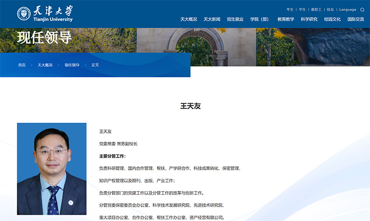 近日,天津大學(xué)官網(wǎng)“現(xiàn)任領(lǐng)導(dǎo)”一欄更新顯示,王天友已任天津大學(xué)常務(wù)副校長。