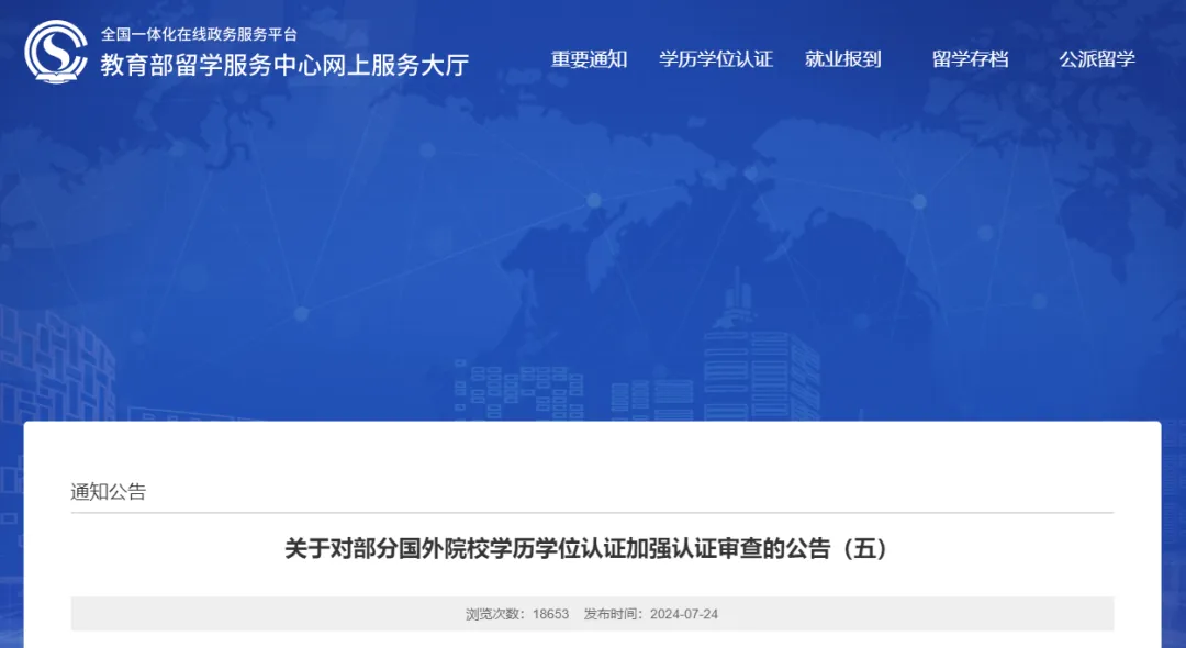 7月24日,教育部留學(xué)服務(wù)中心發(fā)布《關(guān)于對部分國外院校學(xué)歷學(xué)位認(rèn)證加強(qiáng)認(rèn)證審查的公告(五)》,對部分國外院校學(xué)歷學(xué)位認(rèn)證加強(qiáng)認(rèn)證審查。