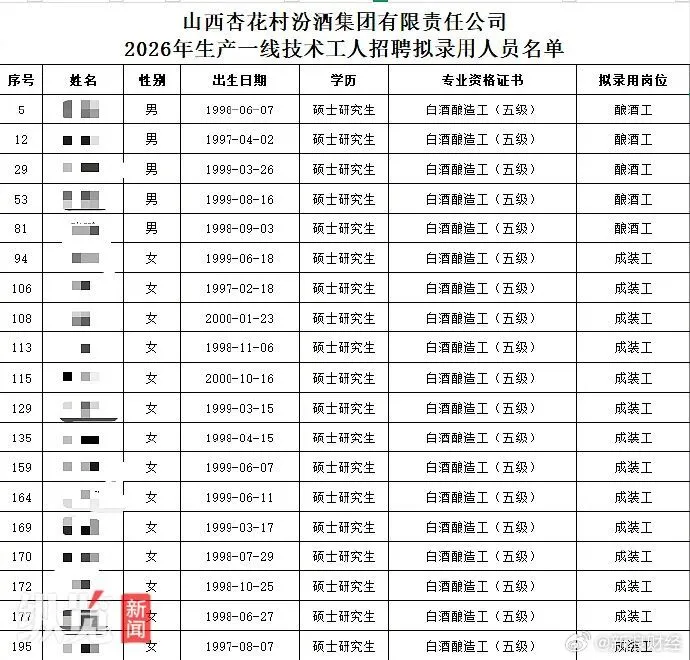 近日,山西杏花村汾酒集團公示了2026年生產(chǎn)一線技術(shù)工人招聘擬錄用人員名單。名單中,釀酒工和成裝工崗位擬錄用人員中出現(xiàn)了19名碩士研究生,引發(fā)關(guān)注和熱議。