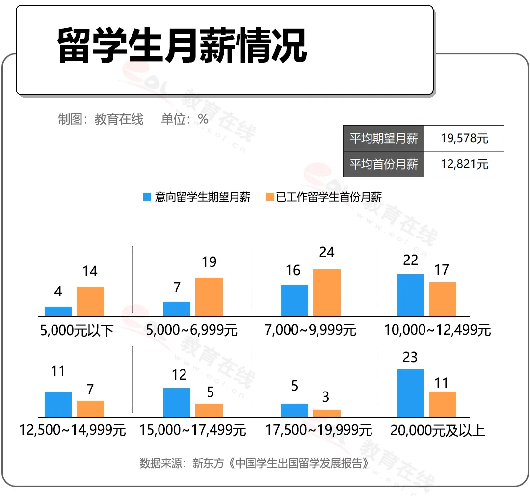 根據(jù)報告,留學(xué)生期望月薪主要集中在20000元及以上(占比23%)和10000-12499元(占比22%),顯示出較高的心理預(yù)期。
