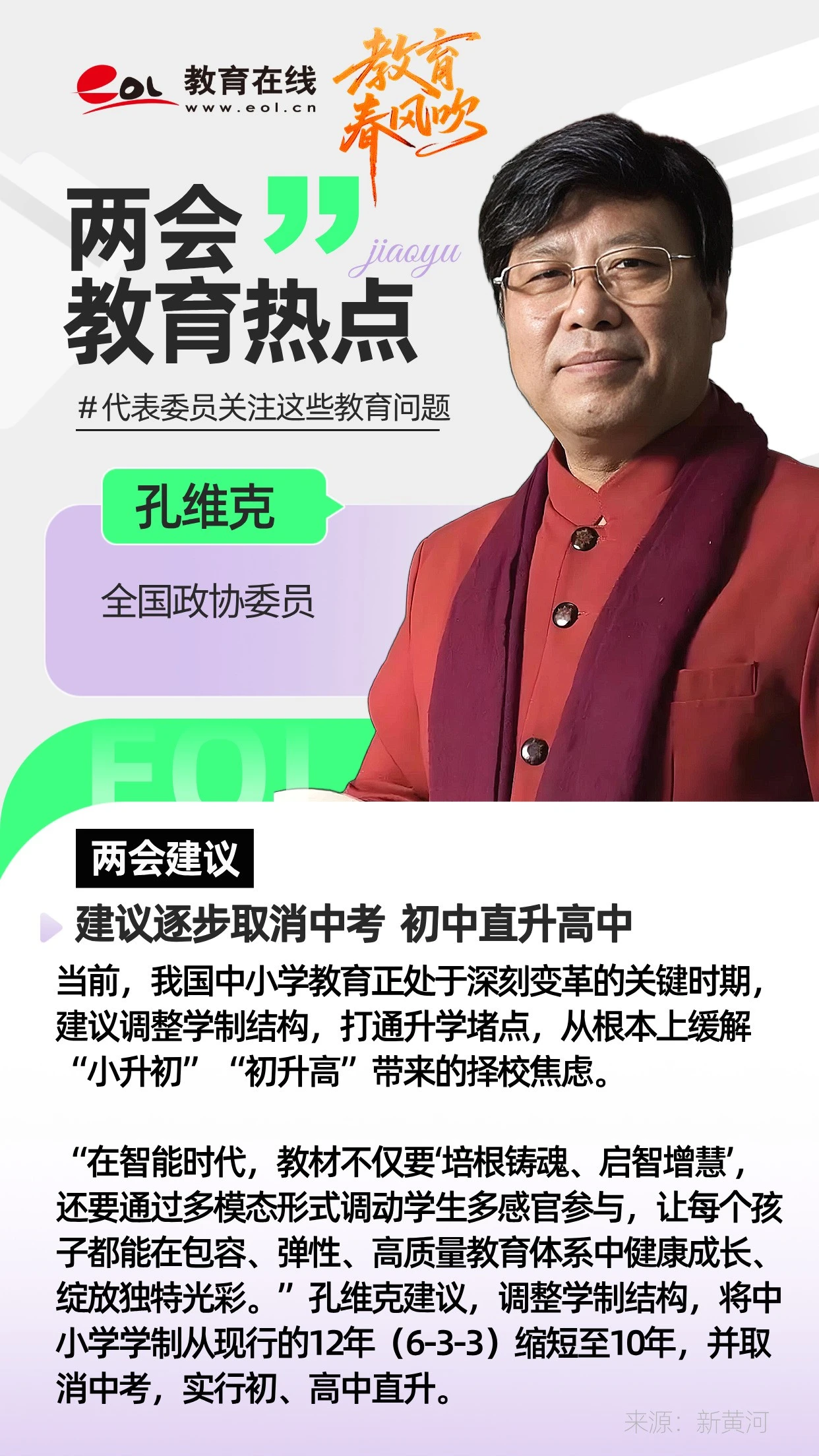 “在現(xiàn)有的學制下,為了小升初、初升高,很多初中,甚至高中的知識都壓到了小學階段,小學生理解不了,還極大增加了心理壓力。”孔維克建議,調整學制結構,將中小學學制從現(xiàn)行的12年(6-3-3)縮短至10年,并取消中考,實行初、高中直升。