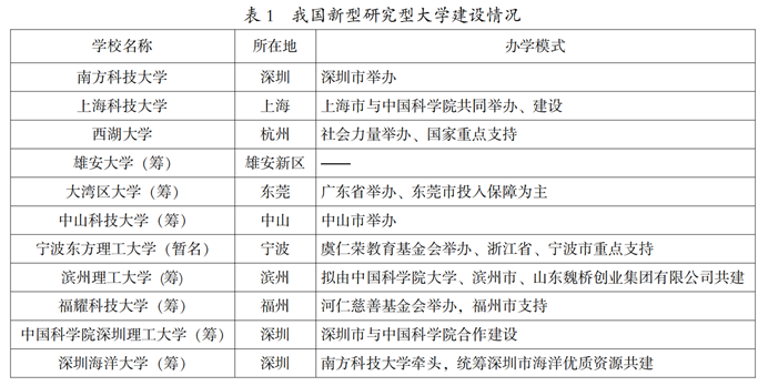 當前,從體量上看,我國已成為高等教育大國,而且正在向強國邁進。特別是從20世紀90年代開始,國家先后實施“211工程”“985工程”,提出建設“世界一流大學”“世界一流學科”的目標,在普及化大發(fā)展的同時,下大力氣提高高等教育質量,促進內涵式發(fā)展,在各大世界大學排名中,中國大學的位次都有明顯提升,也側面反映出中國大學的快速發(fā)展和進步。尤其過去10余年間,以南方科技大學、西湖大學等為代表的新型研究型大學快速興起,除此在我國東南沿海等經濟相對發(fā)達地區(qū)還有多所定位于高水平、研究型的新型大學陸續(xù)謀劃籌建(見表1),在全球范圍內整合優(yōu)質資源,引進高端人才,站在科技前沿,努力在短時間內形成沖擊世界一流的核心競爭力。例如,在《自然》雜志發(fā)布的2021年度年輕大學自然指數(shù)中,南方科技大學排在第2位,西湖大學成為上升最快的25所年輕大學中最年輕的一所,為我國高等教育高質量發(fā)展開辟了新賽道。