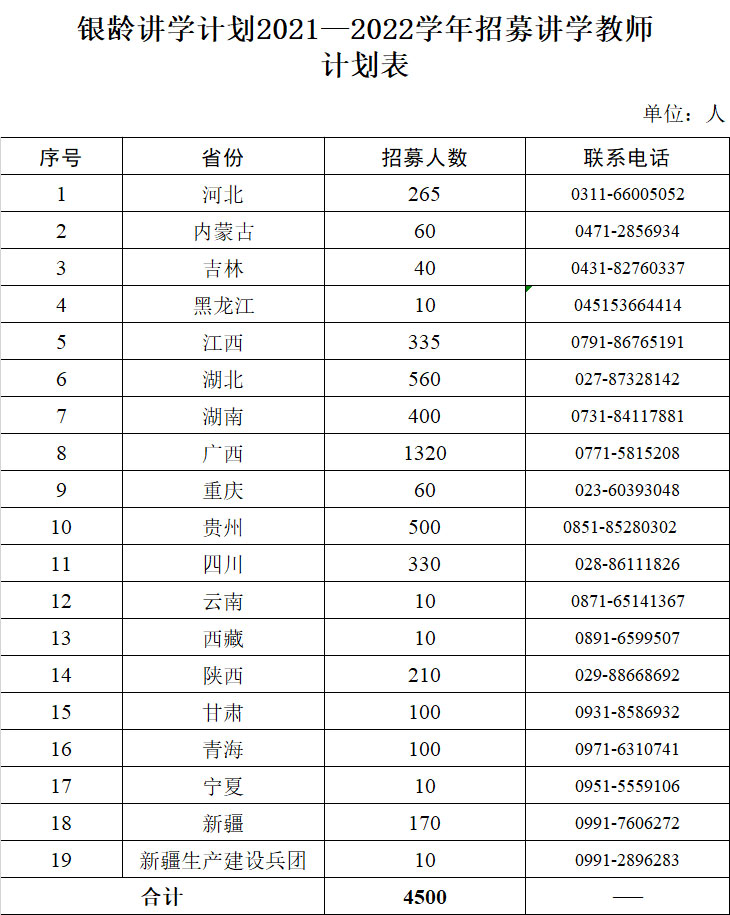 2021年計(jì)劃招募4500名講學(xué)教師。申請銀齡講學(xué)計(jì)劃的退休教師以校長、教研員、特級教師、骨干教師為主。年齡一般在65(含)歲以下。講學(xué)教師原則上應(yīng)具有中級及以上教師職稱,以高級教師為主。原單位返聘退休教師工作不列入銀齡講學(xué)計(jì)劃。