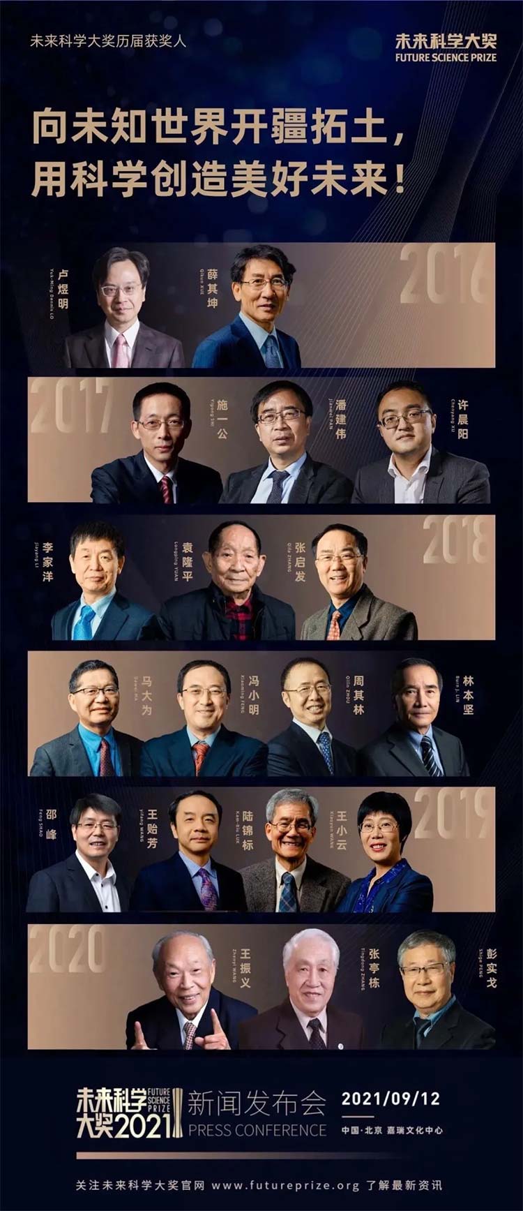 2016年至今,未來(lái)科學(xué)大獎(jiǎng)共評(píng)選出19位獲獎(jiǎng)?wù)撸@得了科學(xué)和社會(huì)領(lǐng)域的廣泛認(rèn)可。他們均是來(lái)自生命科學(xué)、物理、化學(xué)、數(shù)學(xué)、計(jì)算機(jī)等基礎(chǔ)和應(yīng)用研究領(lǐng)域極具成就的科學(xué)家。他們分別是: