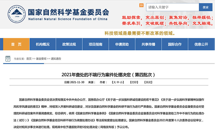 11月30日,國(guó)家自然科學(xué)基金委員會(huì)公布《2021年查處的不端行為案件處理決定(第四批次)》,通報(bào)批評(píng)5起不端行為案件處理決定(網(wǎng)絡(luò)發(fā)布版),共有 5 名學(xué)者受到處罰。