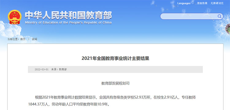 3月1日,教育部發(fā)布2021年全國(guó)教育事業(yè)統(tǒng)計(jì)主要結(jié)果。根據(jù)2021年教育事業(yè)統(tǒng)計(jì)數(shù)據(jù)結(jié)果顯示,全國(guó)共有各級(jí)各類(lèi)學(xué)校52.93萬(wàn)所,在校生2.91億人,專(zhuān)任教師1844.37萬(wàn)人,勞動(dòng)年齡人口平均受教育年限10.9年。