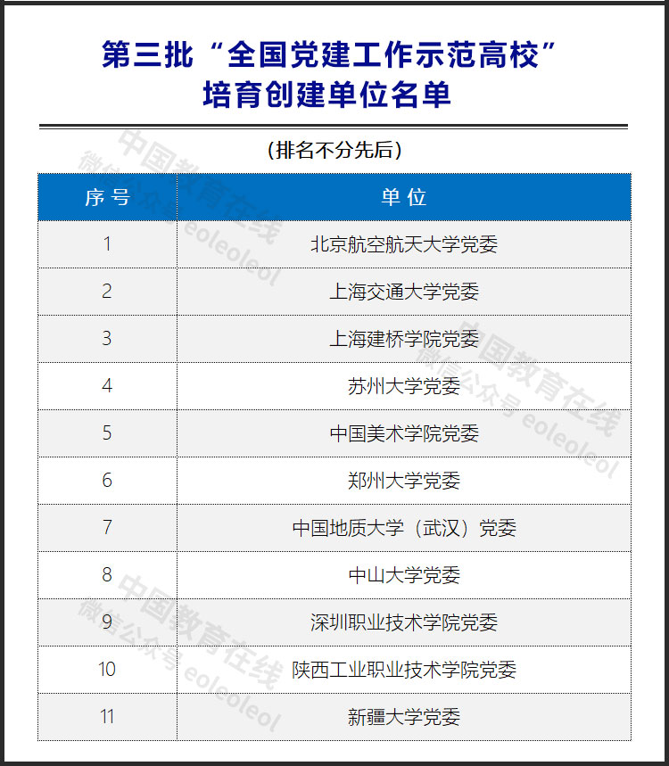 第三批“全國黨建工作示范高?!迸嘤齽?chuàng)建單位名單如下: