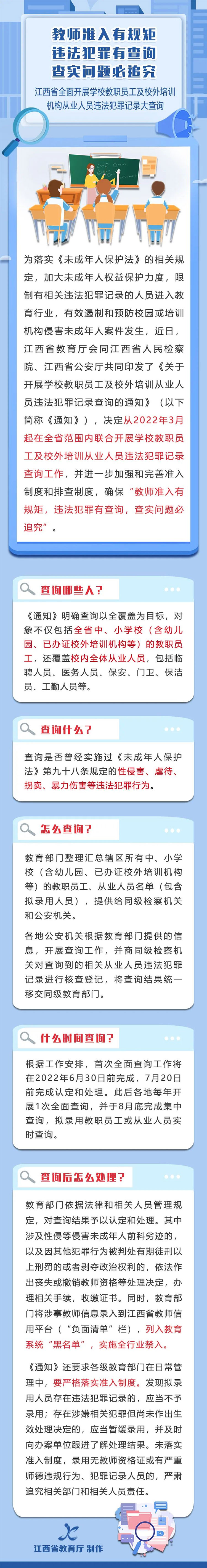 近日,江西省教育廳會(huì)同江西省人民檢察院、江西省公安廳共同印發(fā)了《關(guān)于開展學(xué)校教職員工及校外培訓(xùn)從業(yè)人員違法犯罪記錄查詢的通知》(以下簡(jiǎn)稱《通知》),決定從2022年3月起在全省范圍內(nèi)聯(lián)合開展學(xué)校教職員工及校外培訓(xùn)從業(yè)人員違法犯罪記錄查詢工作,并進(jìn)一步加強(qiáng)和完善準(zhǔn)入制度和排查制度,確保“教師準(zhǔn)入有規(guī)矩,違法犯罪有查詢,查實(shí)問題必追究”。