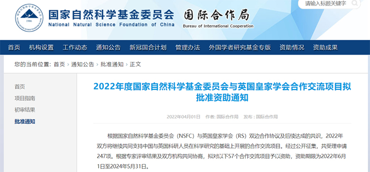 根據(jù)國(guó)家自然科學(xué)基金委員會(huì)(NSFC)與英國(guó)皇家學(xué)會(huì)(RS)雙邊合作協(xié)議及后續(xù)達(dá)成的共識(shí),2022年雙方將繼續(xù)共同支持中國(guó)與英國(guó)科研人員在科學(xué)研究的基礎(chǔ)上開(kāi)展的合作交流項(xiàng)目。經(jīng)過(guò)公開(kāi)征集,共受理申請(qǐng)247項(xiàng)。根據(jù)專家評(píng)審結(jié)果及雙方機(jī)構(gòu)共同協(xié)商,擬對(duì)以下57個(gè)合作交流項(xiàng)目予以資助,資助期限為2022年6月1日至2024年5月31日。