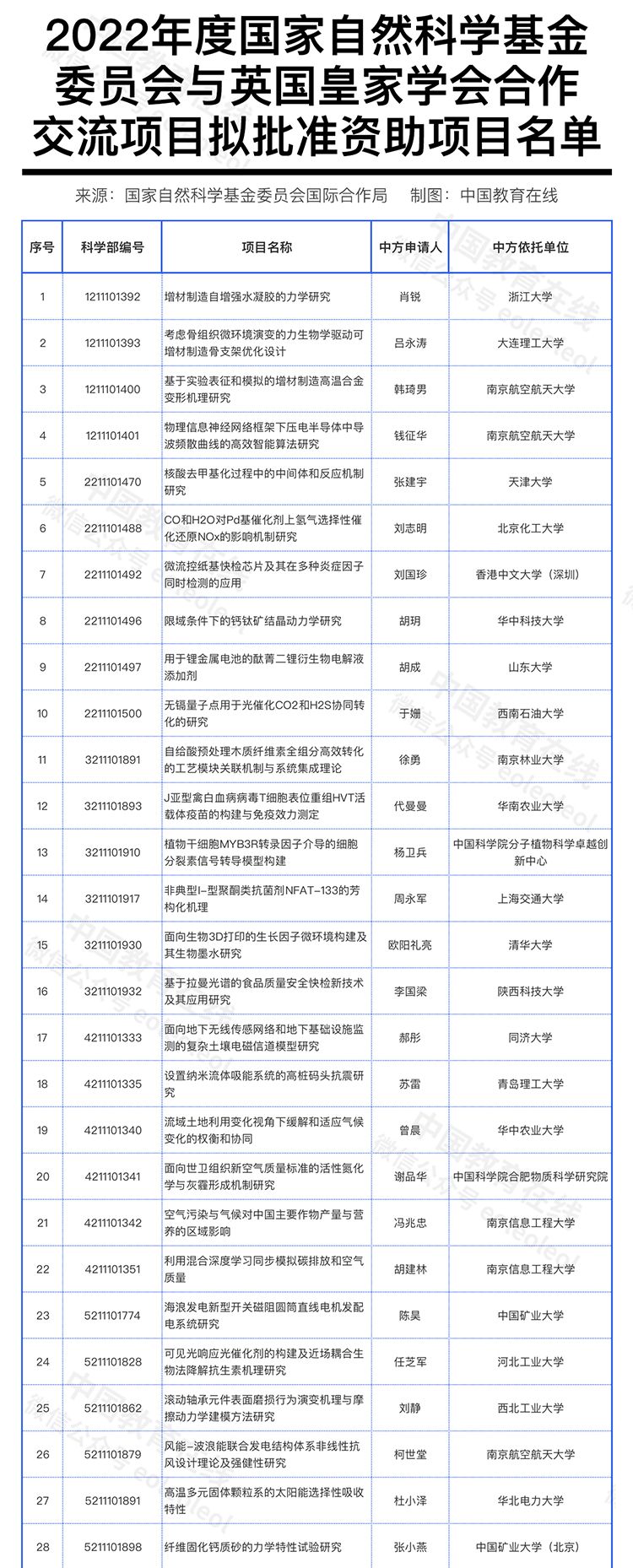 4月1日,國(guó)家自然科學(xué)基金委員會(huì)國(guó)際合作局官網(wǎng)發(fā)布《2022年度國(guó)家自然科學(xué)基金委員會(huì)與英國(guó)皇家學(xué)會(huì)合作交流項(xiàng)目擬批準(zhǔn)資助通知》,擬對(duì)57個(gè)合作交流項(xiàng)目予以資助,其中41所高校入選。