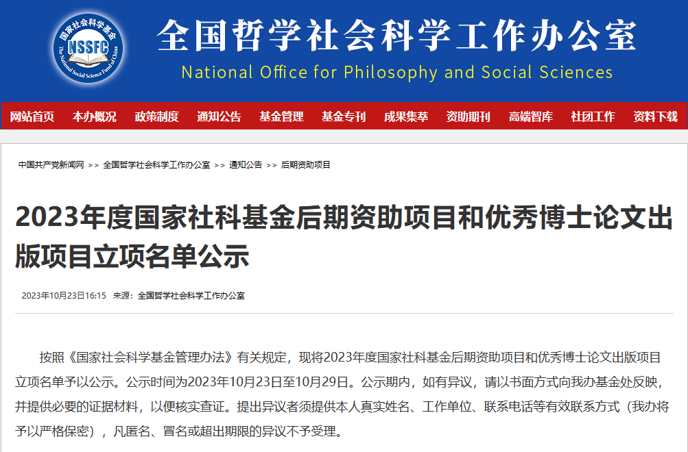 10月23日,全國哲學(xué)社會科學(xué)工作辦公室發(fā)布《2023年度國家社科基金后期資助暨優(yōu)秀博士論文出版項(xiàng)目立項(xiàng)名單公示》,公示時間為2023年10月23日至10月29日。