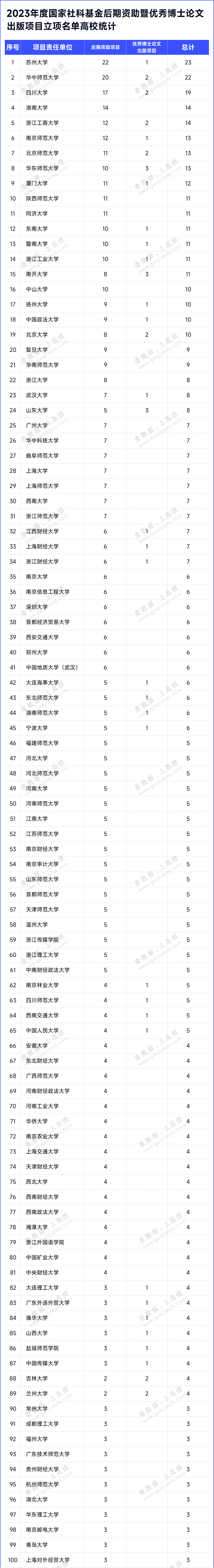 其中蘇州大學(xué)的總擬立項(xiàng)數(shù)量最多,為23項(xiàng);其次是華中師范大學(xué),擬立項(xiàng)數(shù)為22項(xiàng);四川大學(xué)位列第三,擬立項(xiàng)數(shù)為19項(xiàng)。
