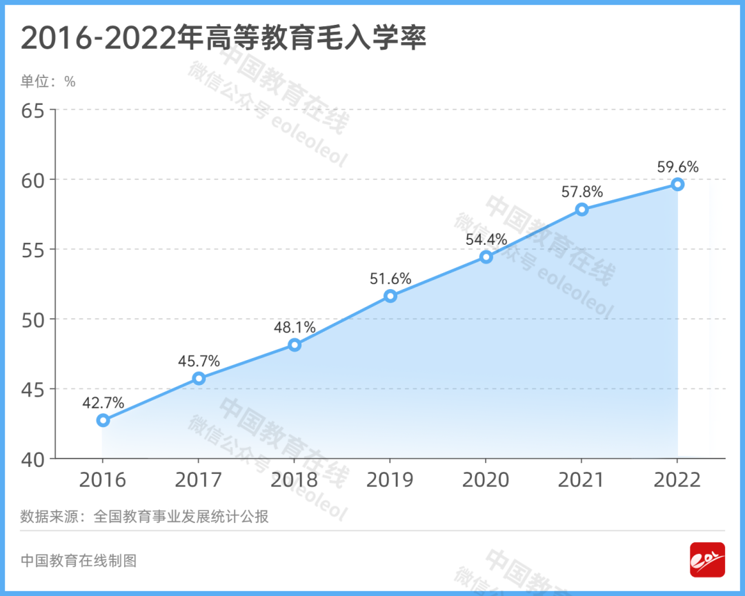 2023年3月,教育部發(fā)布《2022年全國(guó)教育事業(yè)發(fā)展統(tǒng)計(jì)公報(bào)》。公報(bào)顯示,2022年高等教育毛入學(xué)率59.6%,比上年提高1.8個(gè)百分點(diǎn)。