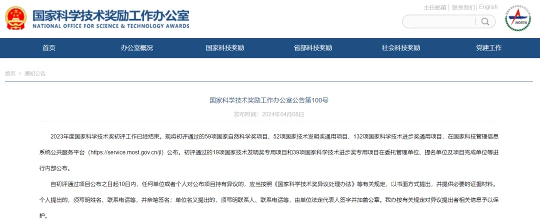 2023年度國家科學(xué)技術(shù)獎初評工作已經(jīng)結(jié)束?,F(xiàn)將初評通過的59項國家自然科學(xué)獎項目、52項國家技術(shù)發(fā)明獎通用項目、132項國家科學(xué)技術(shù)進(jìn)步獎通用項目,在國家科技管理信息系統(tǒng)公共服務(wù)平臺(https://service.most.gov.cn/jl)公布。初評通過的19項國家技術(shù)發(fā)明獎專用項目和39項國家科學(xué)技術(shù)進(jìn)步獎專用項目在委托管理單位、提名單位及項目完成單位等進(jìn)行內(nèi)部公布。