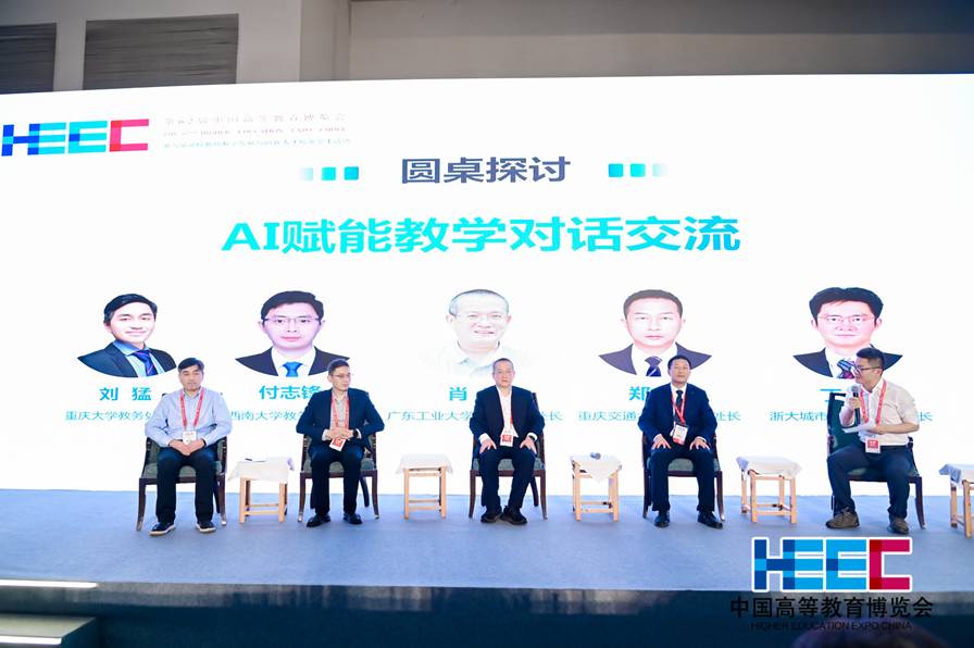 大會(huì)最后一個(gè)環(huán)節(jié)是主題為“AI賦能教學(xué)”的對(duì)話(huà)交流。重慶大學(xué)教務(wù)處處長(zhǎng)劉猛、西南大學(xué)教務(wù)處處長(zhǎng)付志鋒、廣東工業(yè)大學(xué)教務(wù)處副處長(zhǎng)肖明、重慶交通大學(xué)教務(wù)處處長(zhǎng)鄭丹和浙大城市學(xué)院教務(wù)處處長(zhǎng)丁智分別就AI賦能專(zhuān)業(yè)建設(shè)、AI服務(wù)學(xué)生個(gè)性化學(xué)習(xí),教育主管部門(mén)支持教師持續(xù)發(fā)展等方面的問(wèn)題闡述了各自觀點(diǎn)。