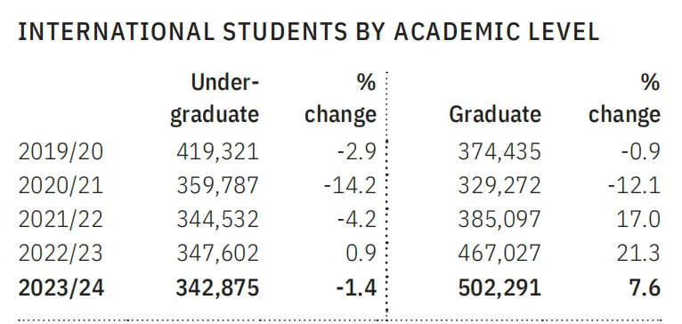 在學(xué)術(shù)層次方面,本科留學(xué)生人數(shù)為342,875人,略有下降;而研究生人數(shù)則達(dá)到502,291人,同比增長(zhǎng)7.6%,顯示出越來越多國(guó)際學(xué)生傾向于赴美攻讀研究生學(xué)位。