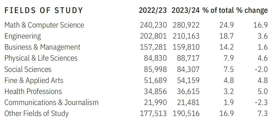 在專業(yè)選擇方面,數(shù)學(xué)與計(jì)算機(jī)科學(xué)專業(yè)依舊是國(guó)際學(xué)生的首選,共有280,922人就讀,其次是工程類專業(yè),共計(jì)210,163人。商業(yè)與管理專業(yè)也廣受歡迎,就讀人數(shù)達(dá)到159,810人。STEM領(lǐng)域的留學(xué)熱度持續(xù)升溫,占據(jù)了整體國(guó)際學(xué)生群體中的半壁江山。