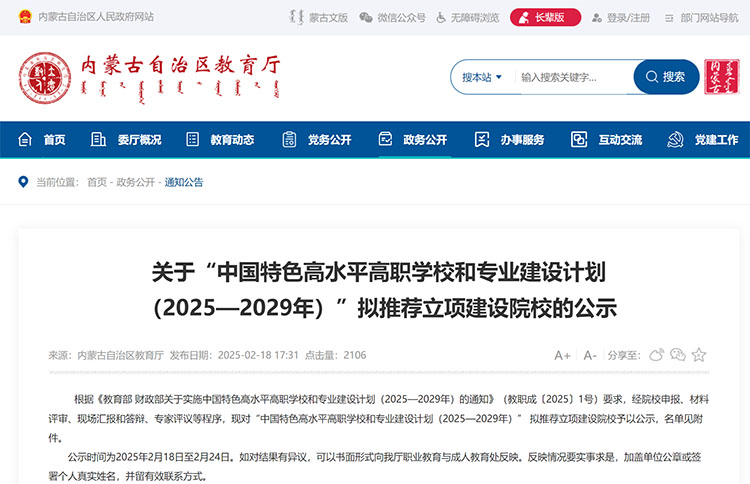 2月19日,內(nèi)蒙古自治區(qū)教育廳發(fā)布《關(guān)于“中國特色高水平高職學校和專業(yè)建設計劃(2025—2029年)”擬推薦立項建設院校的公示》。