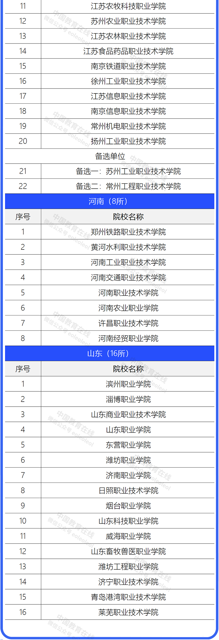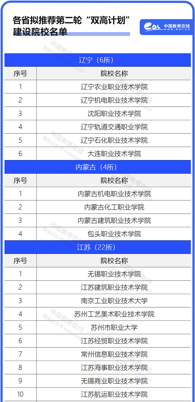 近日,遼寧、內(nèi)蒙古、江蘇、河南、山東等地公示了第二輪國(guó)家“雙高計(jì)劃”推薦名單,據(jù)統(tǒng)計(jì),已有56所院校(含備選)擬獲推薦進(jìn)入新一輪“雙高計(jì)劃”建設(shè)名單。具體名單如下: