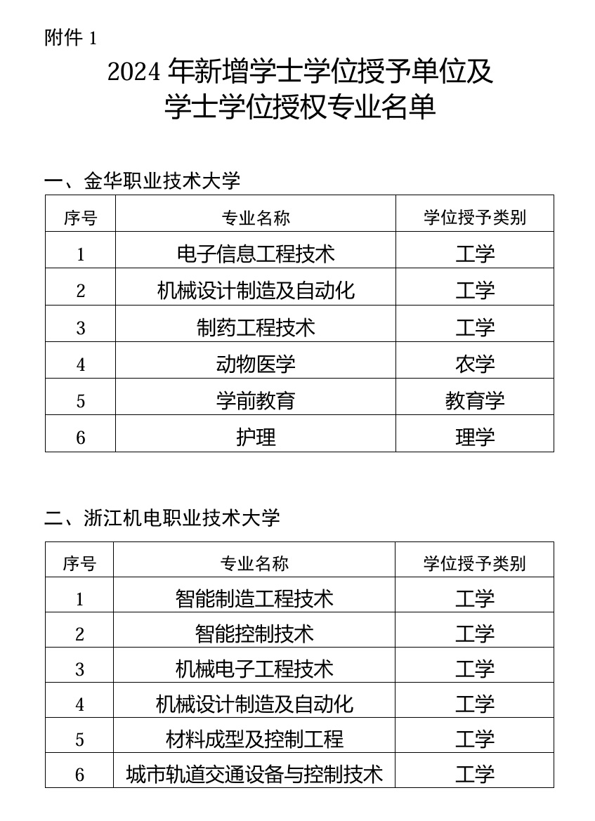 經(jīng)學(xué)校申報、專家評審、省學(xué)位委員會審議,擬新增金華職業(yè)技術(shù)大學(xué)為學(xué)士學(xué)位授予單位,其電子信息工程技術(shù)等6個專業(yè)為學(xué)士學(xué)位授權(quán)專業(yè);新增浙江機(jī)電職業(yè)技術(shù)大學(xué)為學(xué)士學(xué)位授予單位,其智能制造工程技術(shù)等6個專業(yè)為學(xué)士學(xué)位授權(quán)專業(yè);新增浙江工商大學(xué)“日語-國際商務(wù)”雙學(xué)士學(xué)位專業(yè)1個;新增浙江大學(xué)生物育種科學(xué)等68個專業(yè)(含第二學(xué)士學(xué)位專業(yè)3個、建筑學(xué)專業(yè)學(xué)位專業(yè)1個)為學(xué)士學(xué)位授權(quán)專業(yè)。