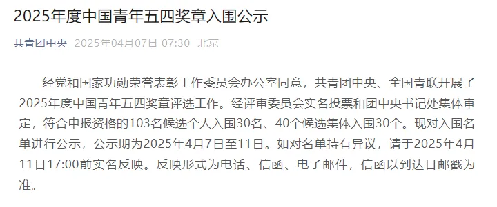 經(jīng)黨和國家功勛榮譽表彰工作委員會辦公室同意,共青團中央、全國青聯(lián)開展了2025年度中國青年五四獎?wù)略u選工作。經(jīng)評審委員會實名投票和團中央書記處集體審定,符合申報資格的103名候選個人入圍30名、40個候選集體入圍30個。