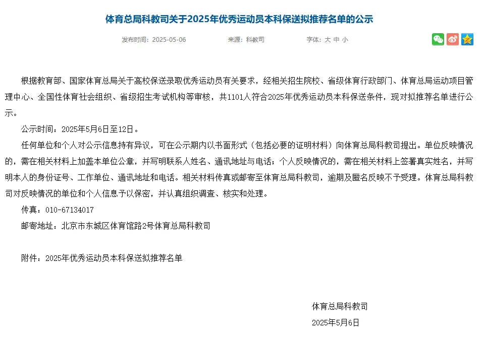 根據(jù)教育部、國家體育總局關于高校保送錄取優(yōu)秀運動員有關要求,經(jīng)相關招生院校、省級體育行政部門、體育總局運動項目管理中心、全國性體育社會組織、省級招生考試機構等審核,共1101人符合2025年優(yōu)秀運動員本科保送條件,現(xiàn)對擬推薦名單進行公示。