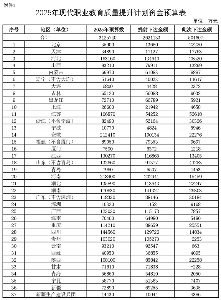 5月19日,財政部、教育部發(fā)布《關(guān)于下達2025年現(xiàn)代職業(yè)教育質(zhì)量提升計劃資金預算的通知》(下簡稱《通知》)。據(jù)《2025年現(xiàn)代職業(yè)教育質(zhì)量提升計劃資金預算表》顯示,2025年預算數(shù)合計312.57億元,提前下達金額262.11億元,此次下達金額50.46億元。
