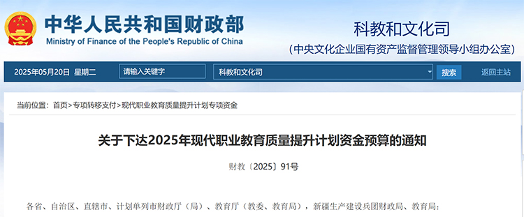 關(guān)于下達2025年現(xiàn)代職業(yè)教育質(zhì)量提升計劃資金預算的通知 財教〔2025〕91號
