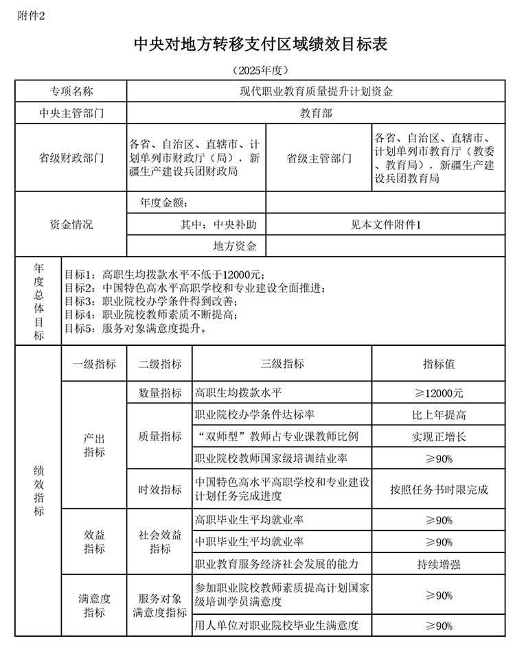 為貫徹落實中共中央和國務院印發(fā)的《教育強國建設(shè)規(guī)劃綱要(2024—2035年)》、中央辦公廳和國務院辦公廳印發(fā)的《關(guān)于深化現(xiàn)代職業(yè)教育體系建設(shè)改革的意見》等有關(guān)精神,經(jīng)研究,現(xiàn)核定下達你省(自治區(qū)、直轄市、計劃單列市、新疆生產(chǎn)建設(shè)兵團)2025年現(xiàn)代職業(yè)教育質(zhì)量提升計劃資金預算(以下簡稱提升計劃資金,項目代碼:Z135050009055),詳見附件1。收入列2025年政府收支分類科目“1100245教育共同財政事權(quán)轉(zhuǎn)移支付收入”,支出列“205教育支出”。現(xiàn)將有關(guān)事項通知如下: